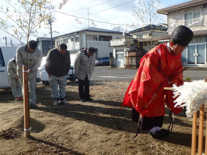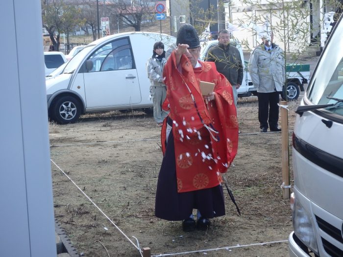 工事の着工にあたり、神職をお招きして神様にお供え物をし、