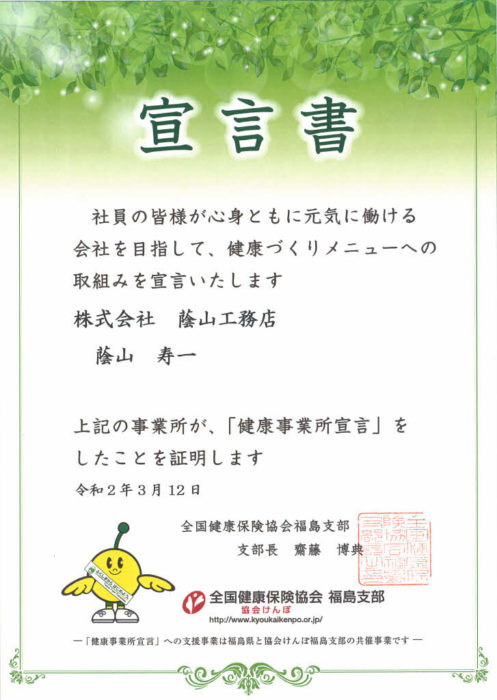 への取組みを宣言する『健康事業所宣言』をいたしました。さらなる社員・職場全体の