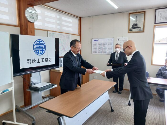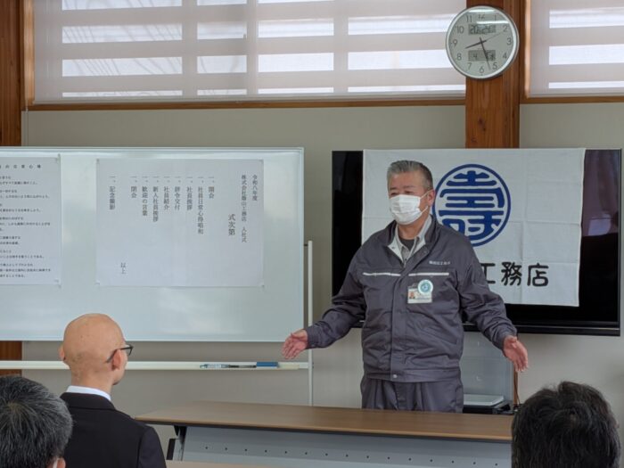 式では辞令交付のほか、社長と工事部長より歓迎の言葉が贈られました。