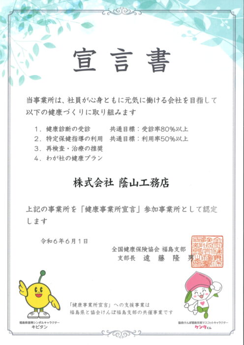 社員が心身ともに元気に働ける会社を目指し、健康づくりメニューへの取組みを宣言する『健康事業所宣言』をいたしました。 前回より社員の健康への意識の高まりも感じていますが、さらなる社員・職場全体の健康づくりに努めていきたいと思います。